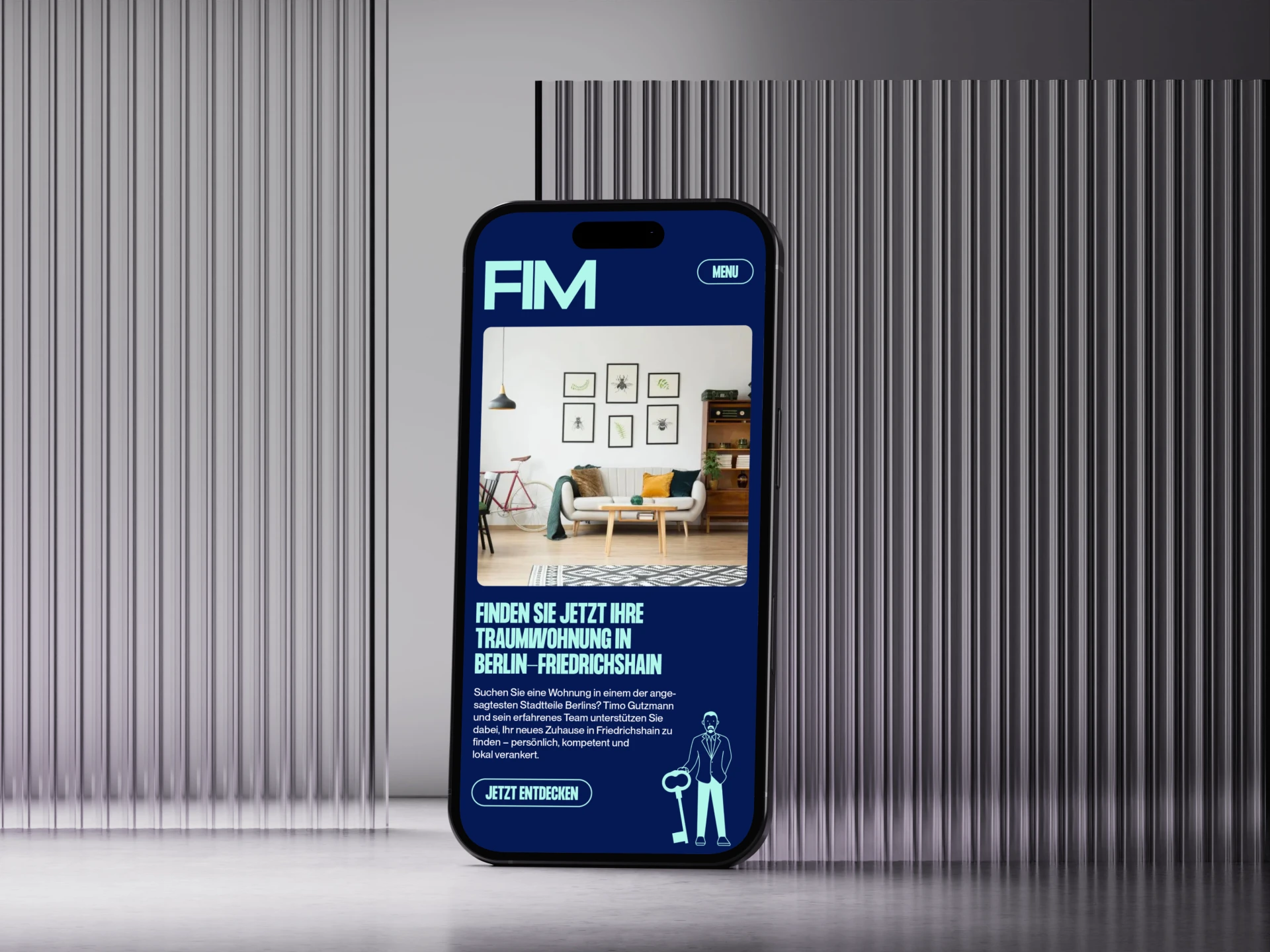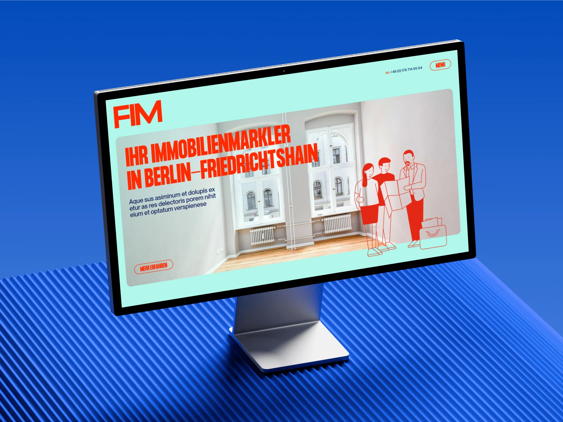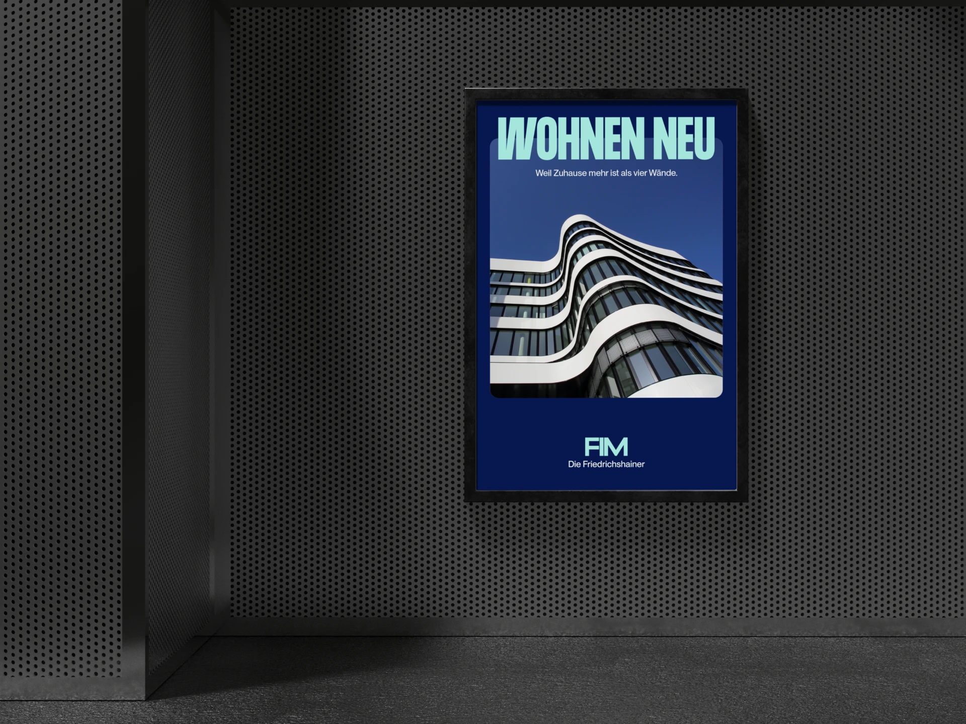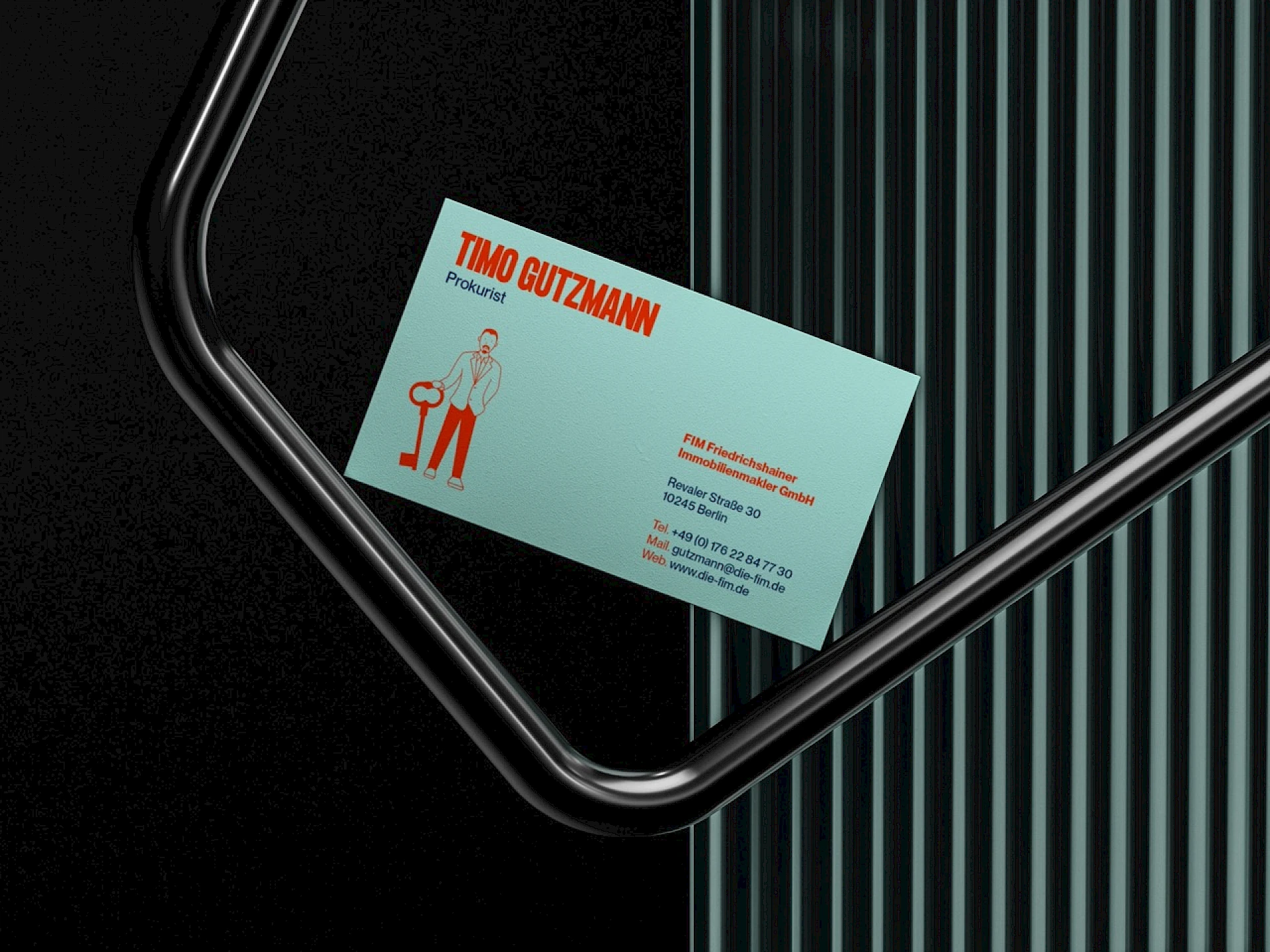 Die Friedrichshainer Immobilienmakler GmbH, kurz FIM, hat uns daher damit beauftragt, ihnen ein einzigartiges Branding zu verpassen. Nach intensiver Diagnose des Wettbewerbs und der klaren Identifikation von FIMs Werten waren wir uns sicher: old-money-Style, Serifen und klassische Anzüge sind nicht drin. In einem entkoppelten „Vermieter-Markt“ sollte FIM so aussehen, wie sie sind: sympathisch, fresh und vor allem beziehungsfähig.