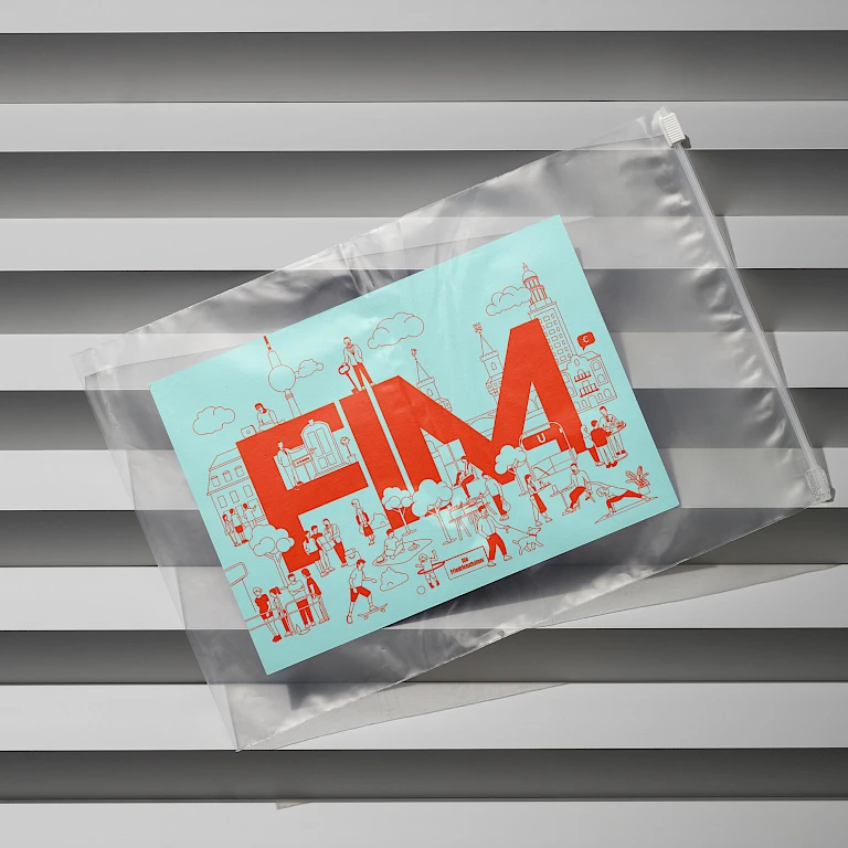 Der persönliche Kontakt auf Augenhöhe, in einer Stadt, in der sie sich auskennen wie kein:e Zweite:r, ist den Friedrichshainern wichtig. Zentral für den umgesetzten Entwurf waren daher individuell handgezeichnete Illustrationen des Kiezlebens. Wir haben nicht nur Fernsehturm oder Oberbaumbrücke, nein, wir haben Berghain-Schlange, Yogaklasse und Hula-Hoop. Mittendrin sind immer mal wieder Timo und Michael – Prokurist und Gründer von FIM – zu sehen. Die Friedrichshainer zeigen so, dass sie Wert auf authentische Leistung legen und interessiert am Leben um sie herum, nicht nur am Verkauf sind.